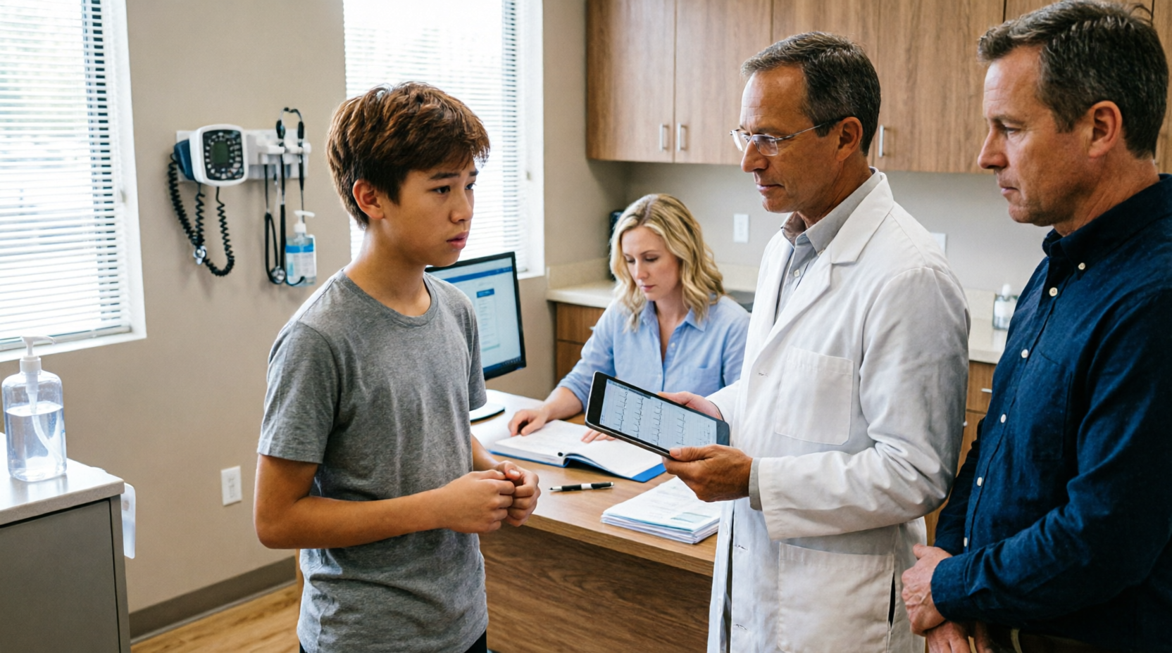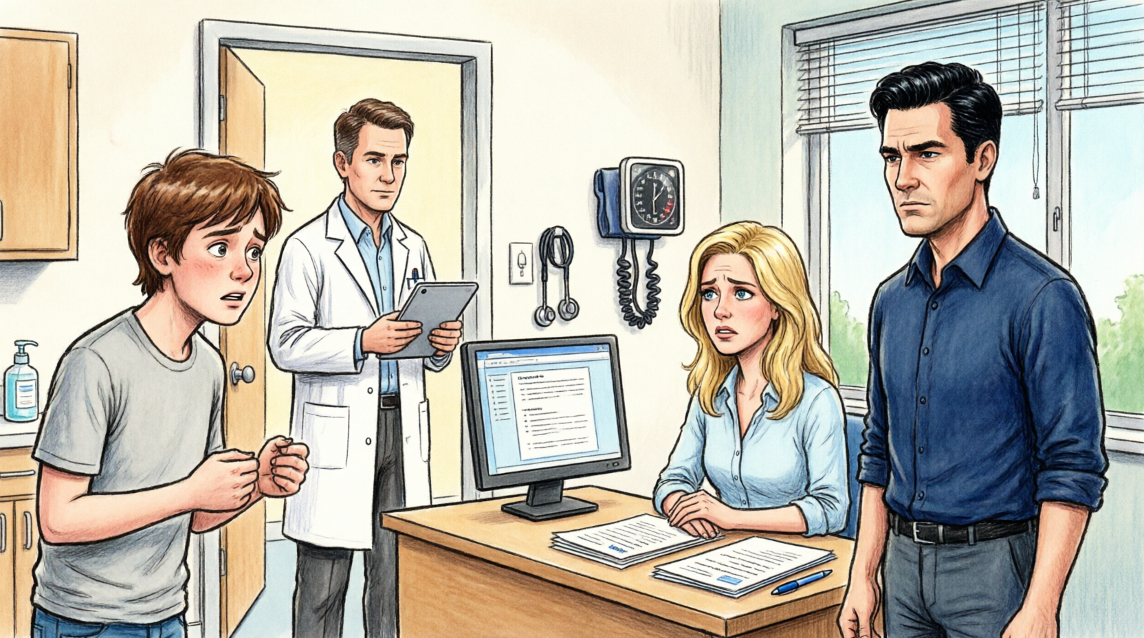 The exam room was too bright. Fluorescent lights that made skin look pale and tired. A paper-covered table crinkled when Nora sat, and she flinched like it was a surprise. I took the chair closest to her. Caleb stayed standing, leaning on the counter near the sink, eyes on the wall chart like he was studying it.