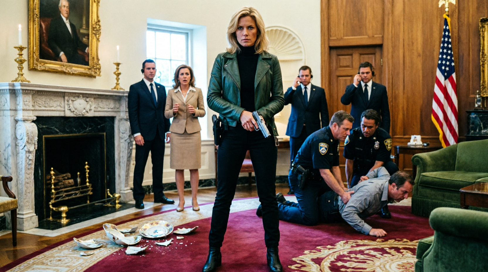 Two officers entered first. One was young and broad-shouldered. The other was a woman in her fifties with sharp eyes and silver threaded through her dark hair.